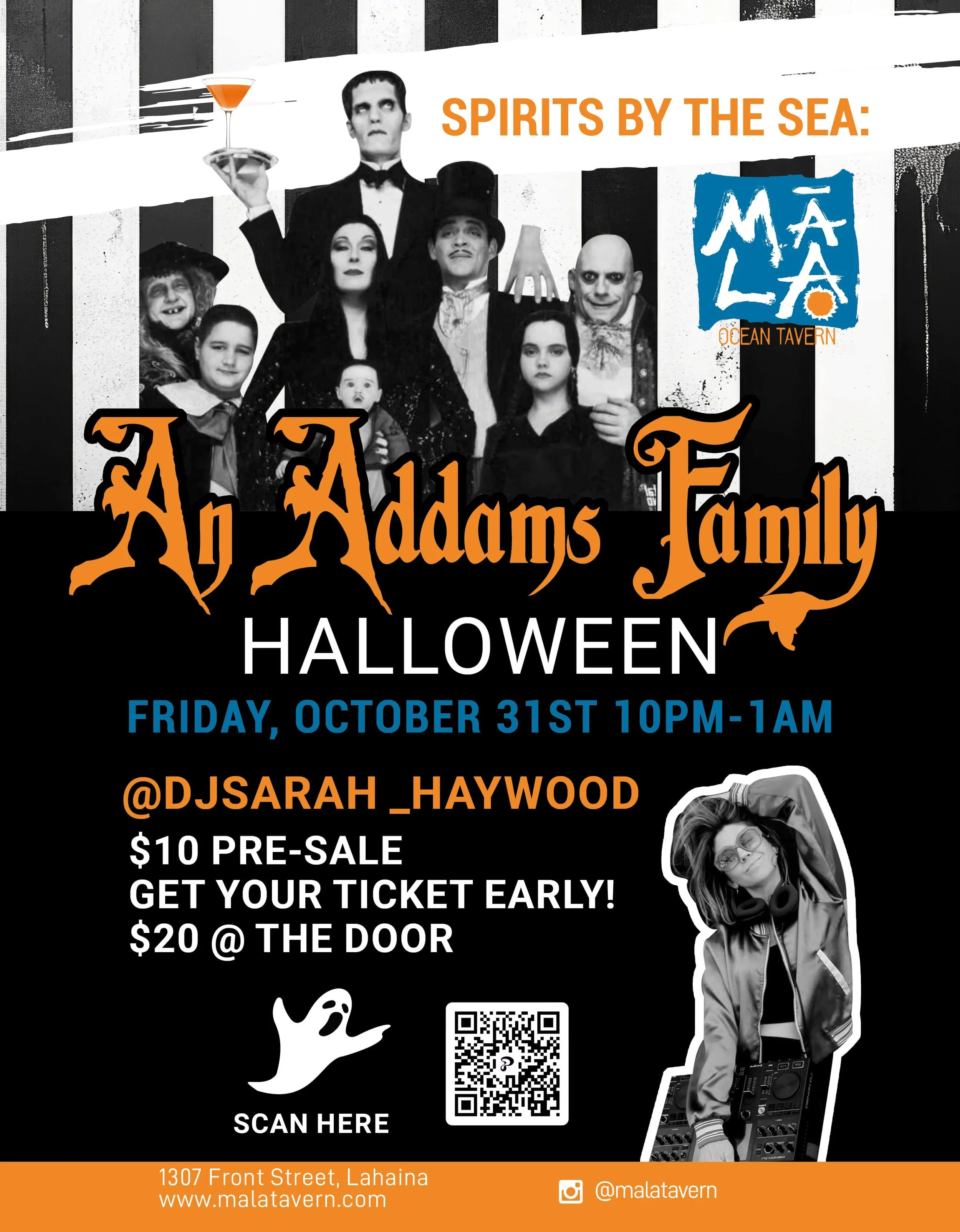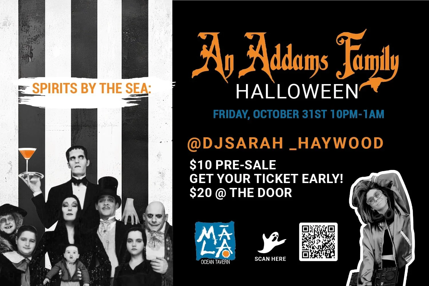 Celebrate Halloween oceanfront at Māla Ocean Tavern in Lahaina with Spirits by the Sea: An Addams Family Halloween. Join us Friday, October 31st from 10PM–1AM for a spooky-chic night featuring DJ Sarah Haywood, craft cocktails, and eerie Addams-inspired vibes. Tickets are $10 pre-sale or $20 at the door. Costumes encouraged!