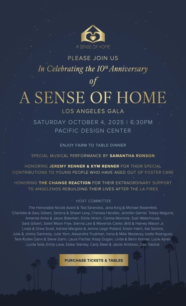 Guests at the 10th Anniversary Gala will enjoy a farm-to-table dinner, a special performance by Samantha Ronson, and tributes to honorees Jeremy & Kym Renner and The Change Reaction. Together, the evening will shine a light on the incredible impact A Sense of Home has had in Los Angeles and beyond.