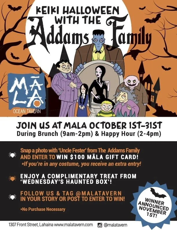 Celebrate Keiki Halloween at Māla Ocean Tavern! Snap a photo with Uncle Fester, win a $100 gift card, enjoy spooky treats, and family fun all October.