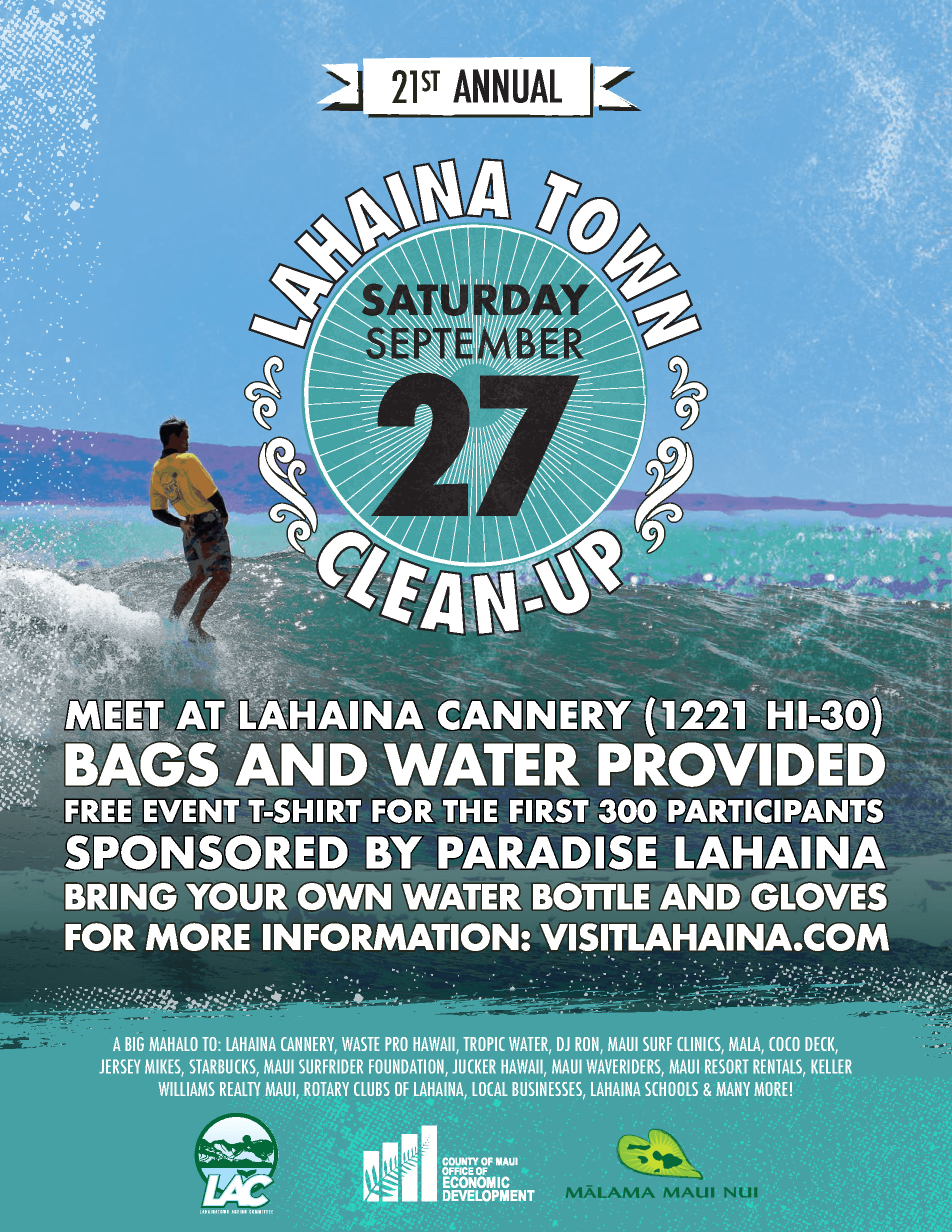 Volunteers will receive the official Lahaina Town Cleanup t-shirt, courtesy of Paradise Lahaina, while supplies last. Please bring:
